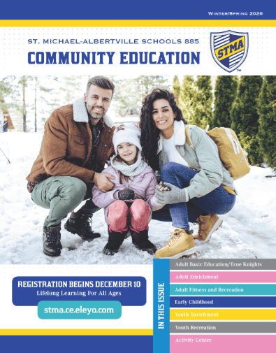 Welcome to STMA Community EducationView Online Catalog:Fall 2025Winter Spring 2026 - COMING SOON (Registration opens December 10 @ 12:00am)Need help? Visit the Eleyo Parent GuideSTMA CE Office Hours:Monday-Friday, 8:00am - 4:00pmPhone: 763-497-6550 Youth programs KIDS PLAY & JUST 4 KIDS YOUTH ENRICHMENT YOUTH RECREATION Early Childhood EARLY CHILDHOOD FAMILY EDUCATION EARLY CHILDHOOD SCREENING BRIGHT BEGINNINGS PRESCHOOL Adult Programs ADULT ENRICHMENT ADULT FITNESS & RECREATION ADULT BASIC EDUCATION & GED AQUATICS ACTIVITY CENTER INFORMATION St. Michael-Albertville Community Education60 Central Ave W, St. Michael MN 55376763-497-6550Find us on Facebook!